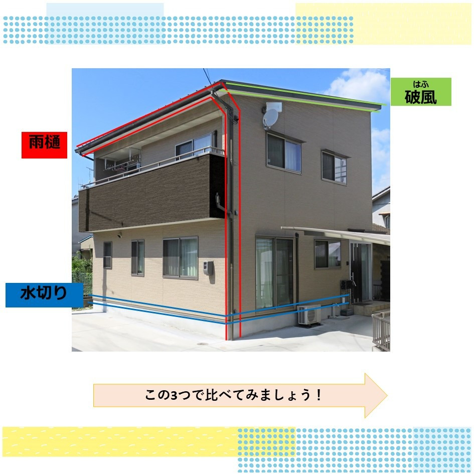 今回は付帯部(雨樋・破風・水切り)の3箇所でくらべてみましょう!!
