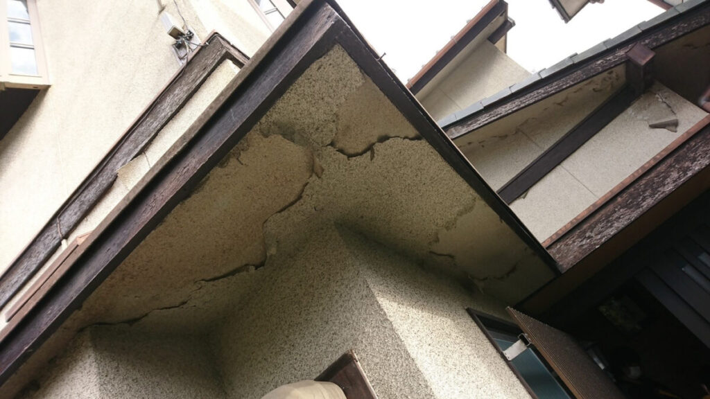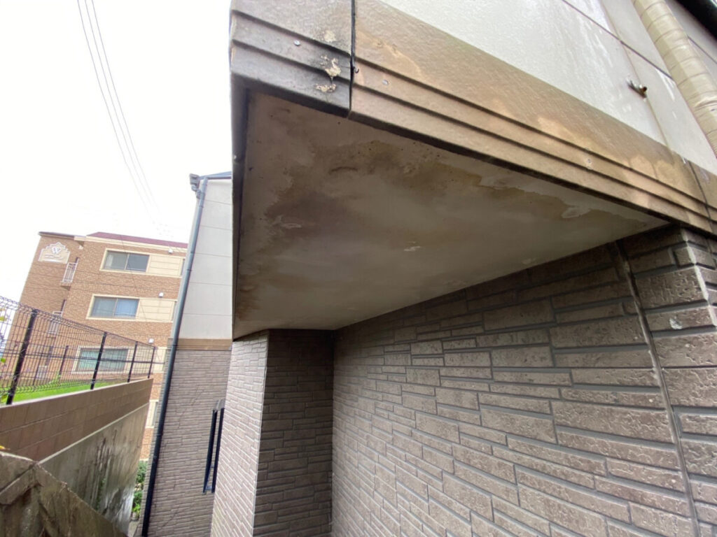 外壁が水を吸ったり、クラックやシーリング劣化部分から水が入ると、だいたいはこの軒天部分に水がたまりはじめます💦