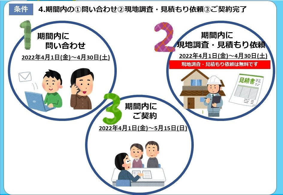 期間内に問い合わせ、無料現地調査・無料見積もり、ご契約が完了された