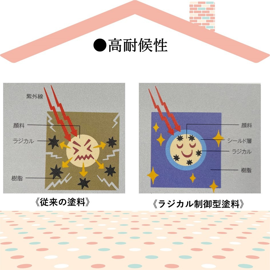 一般塗料に含まれる顔料に主成分の「酸化チタン」は赤外線の影響を受けると「ラジカル」と呼ばれる劣化因子を発生させます💦
