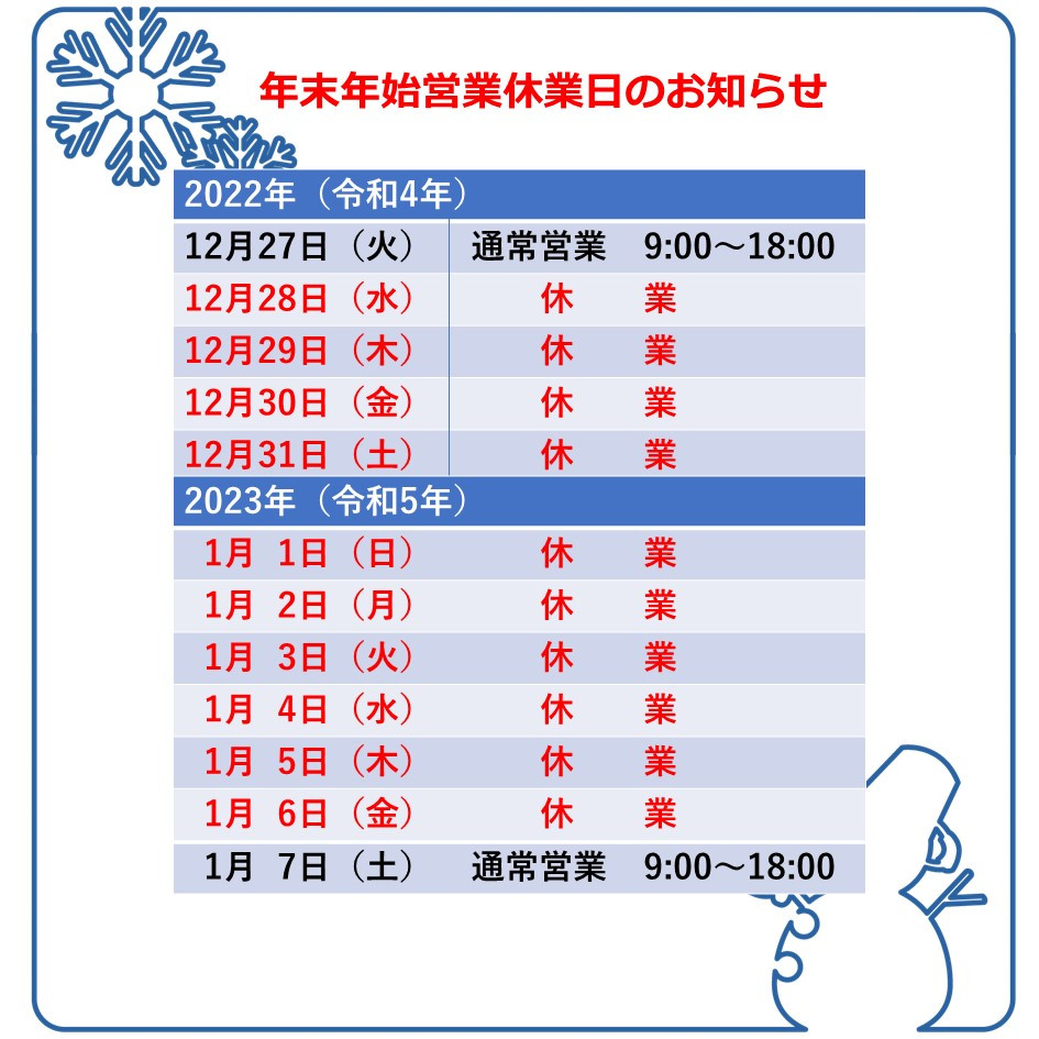 休業中に頂きましたお問い合わせにつきましては、令和5年1月7日(土)以降に