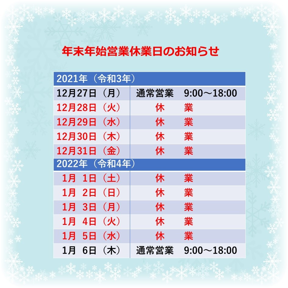 休業中に頂きましたお問い合わせにつきましては、令和4年1月6日(木)以降に
