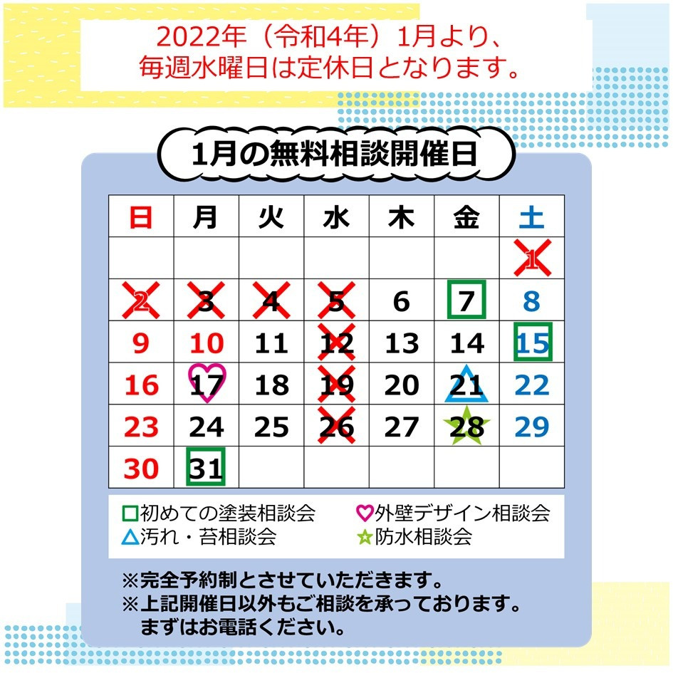 また、2021年(令和4年)1月より毎週水曜日が定休日となります。