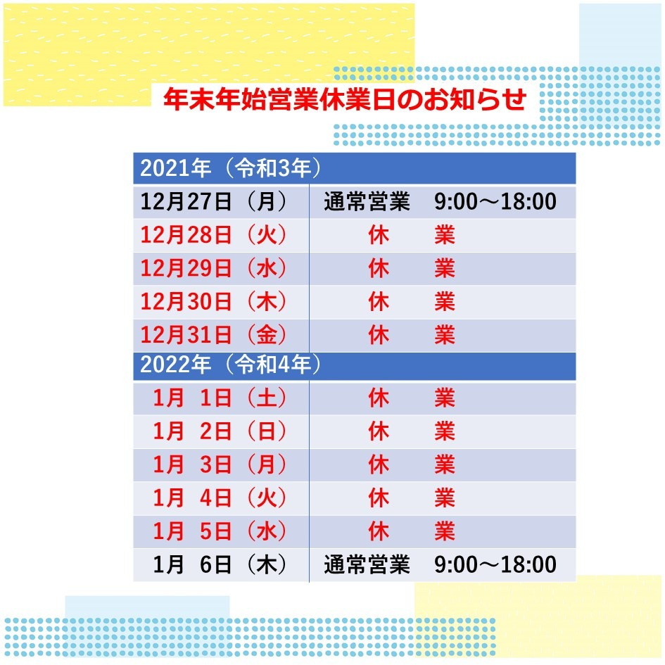 休業中に頂きましたお問い合わせにつきましては、2022年(令和4年)1月6日(木)以降にご連絡させていただきます。