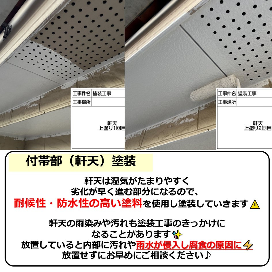 軒天は湿気がたまりやすく劣化が早く進む部分になるので、 耐候性・防水性の高い塗料を使用し塗装していきます⚠️