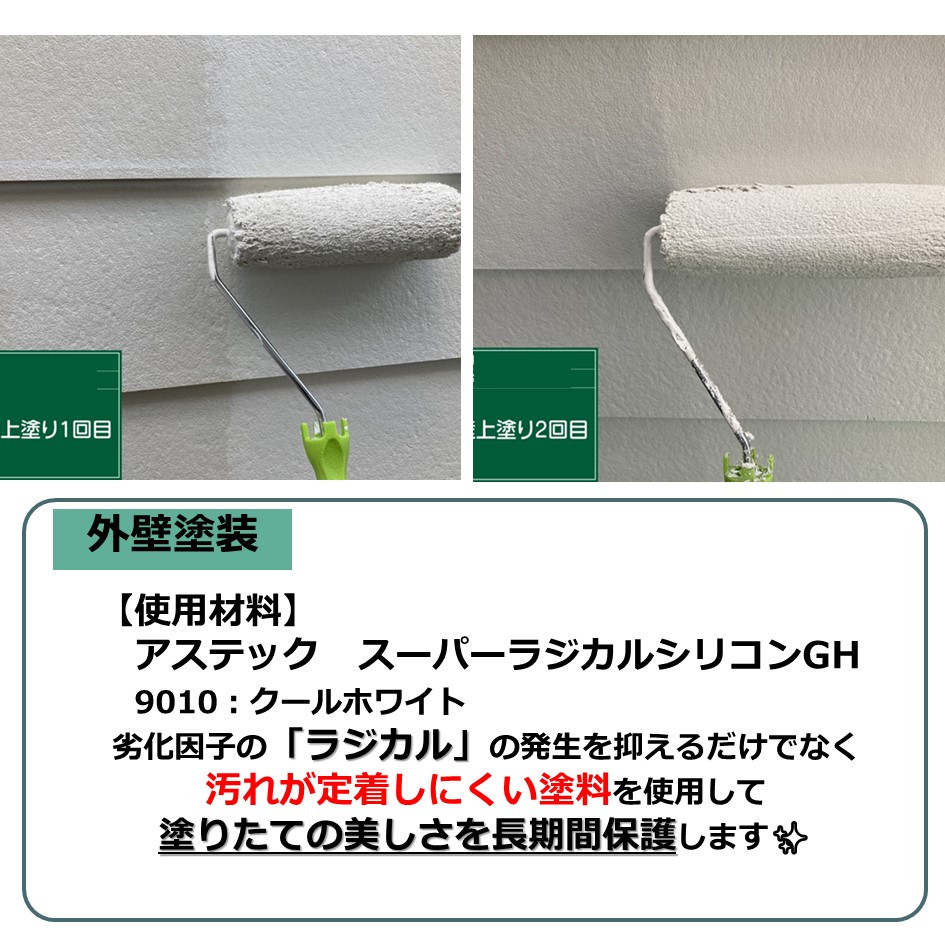しかし!今回使用した塗料は、紫外線によって発生する劣化因子の「ラジカル」の発生を抑え、建物を守る効果の高い塗料です😊👍👍