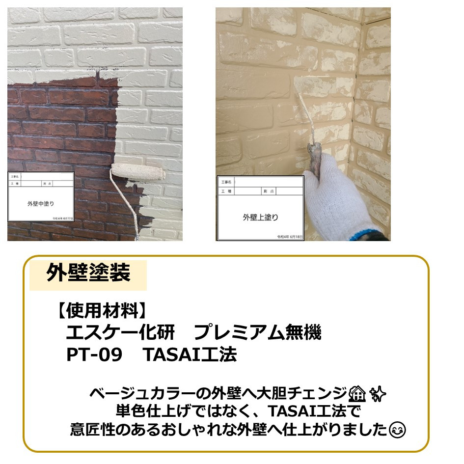 単色仕上げではなく、TASAI工法で意匠性のあるおしゃれな外壁へ仕上がりました😊