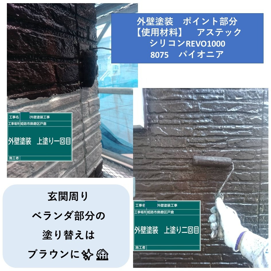 玄関部分と、ベランダ部分に差し色のブラウンを入れての塗替えでした🏡✨