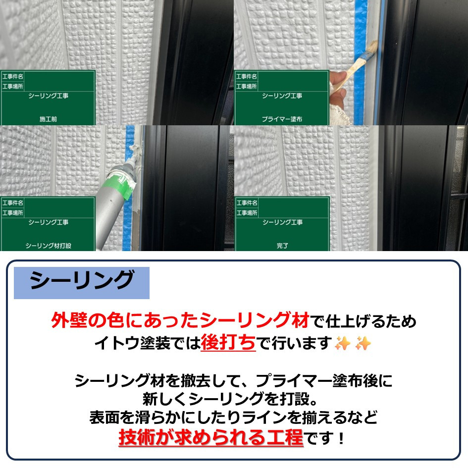 外壁の色にあったシーリング材で仕上げるため、イトウ塗装では後打ちで行います✨✨
