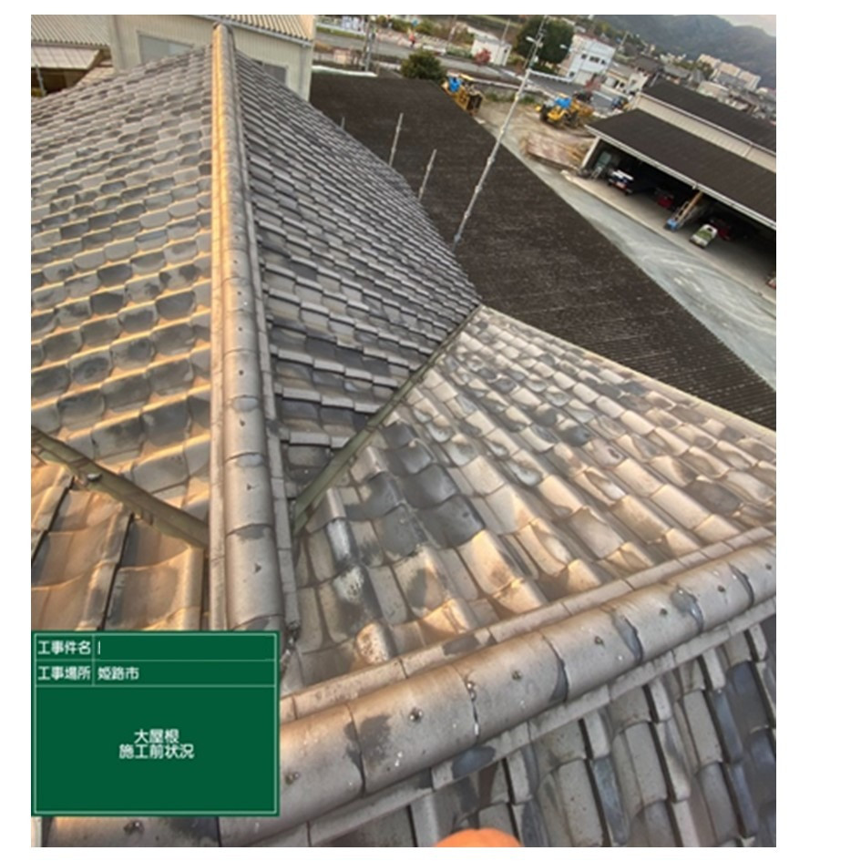いぶし瓦の風合いを活かし、吹付けで仕上げたビフォーの写真とアフタ-写真を見比べられて、