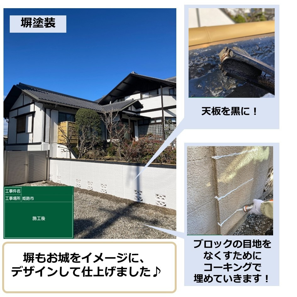 塀のブロックは目地が目立たないようにコーキング材で埋めてより真っ白になるように塗り替えを行いました✨