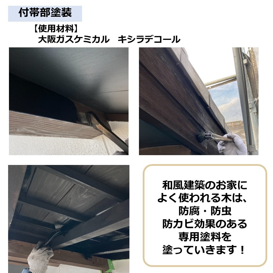 和風のお家の付帯部によく使用される木材は、専用の塗料「キシラデコール」を使用しました。