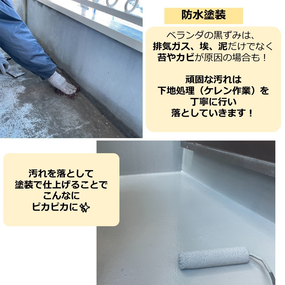 ベランダの黒ずみ汚れは、排気ガス、埃、泥だけでなく苔やカビが原因の場合もあります!