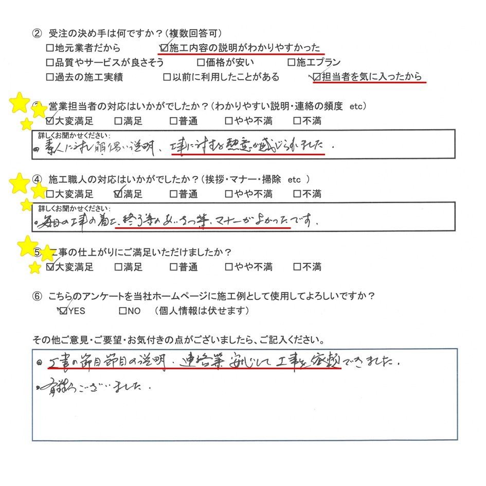 今回の施行主様に「工事節目 節目の説明、連絡等安心して任せることができた」と