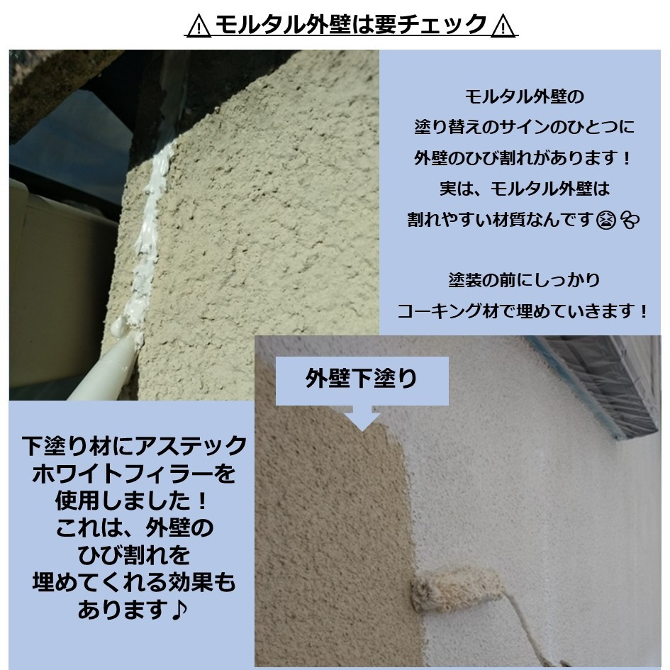 下塗り材に使用したアステックのホワイトフィラーは、外壁のひび割れを埋めてくれる効果のある下塗り材です!