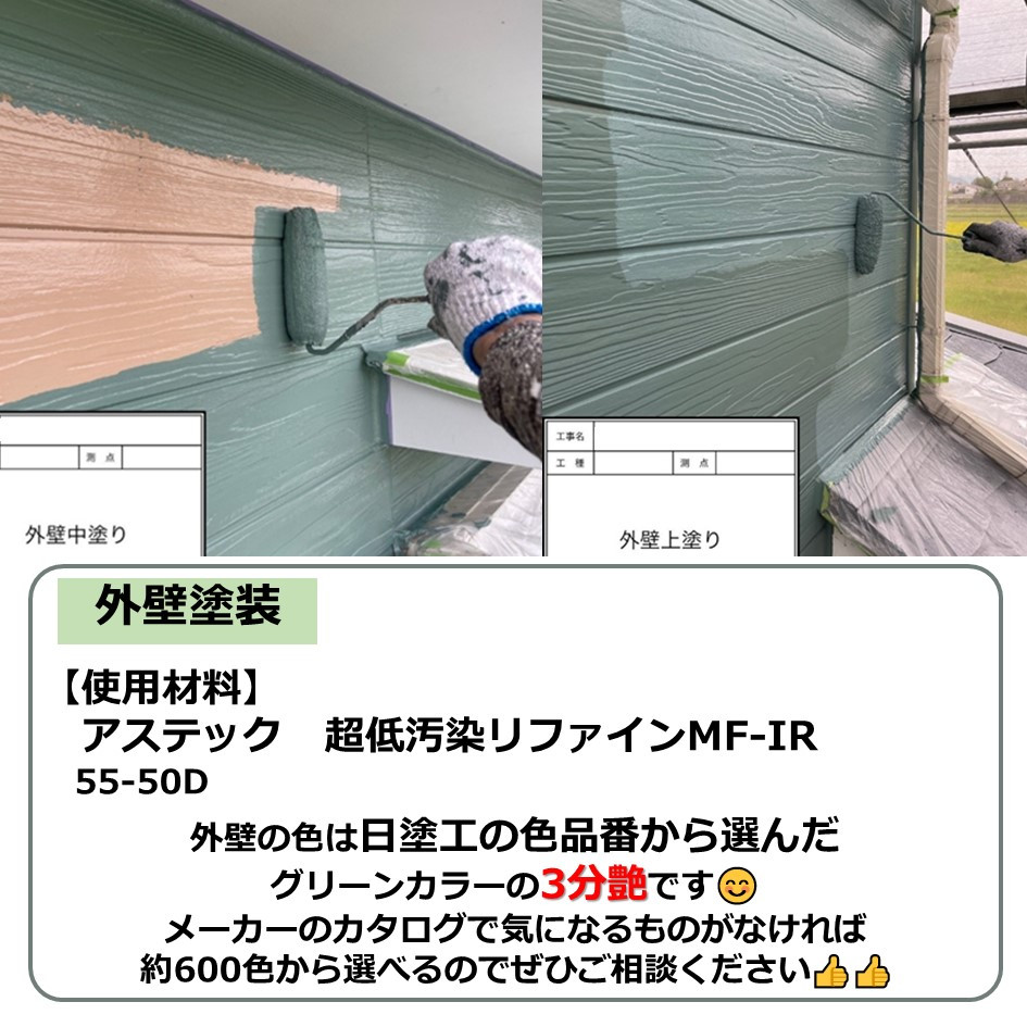 外壁の色は日塗工の色品番から選んだグリーンカラーの3分艶です😊