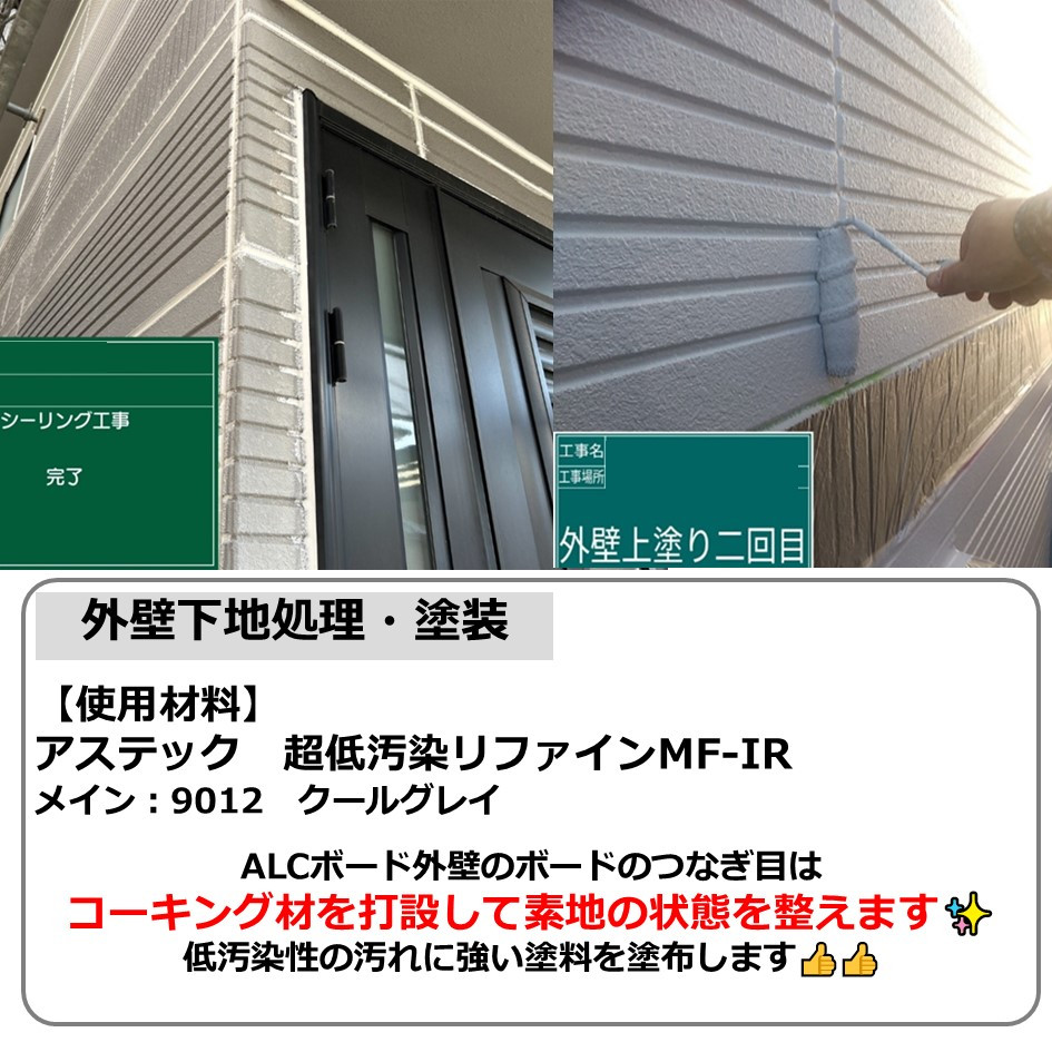 ALCボード外壁のボードのつなぎ目はコーキング材を打設して素地の状態を整えます✨