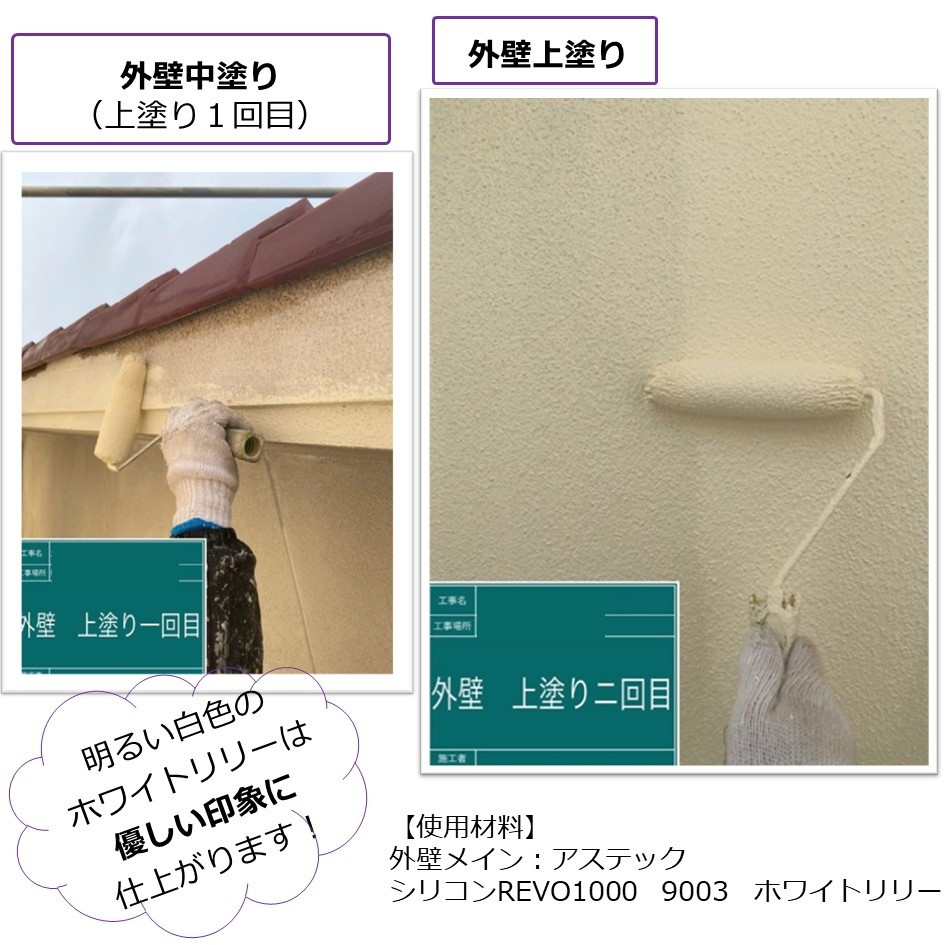 シリコンREVO1000は特殊な三重構造のアクリルシリコンを使用しており、一般的な塗料よりも強靭な層でコーティングされているため、塗膜表面に汚れが付着しにくいという特徴をもっています😊
