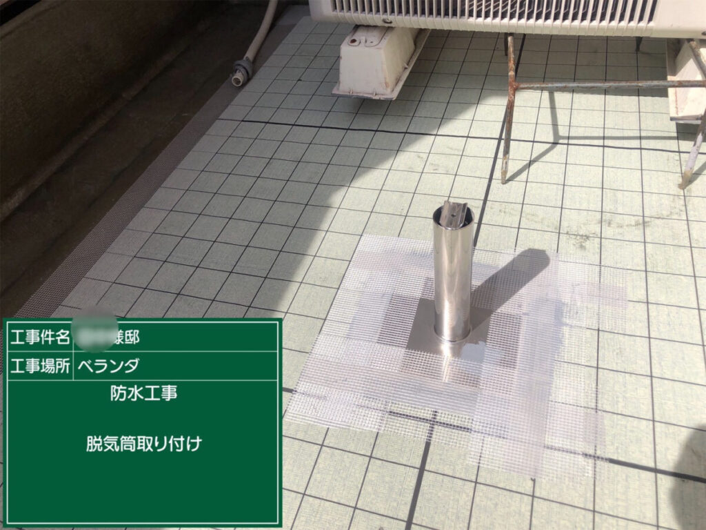 ベランダ床の内部から出る水分を脱気筒から外に逃す工法です。