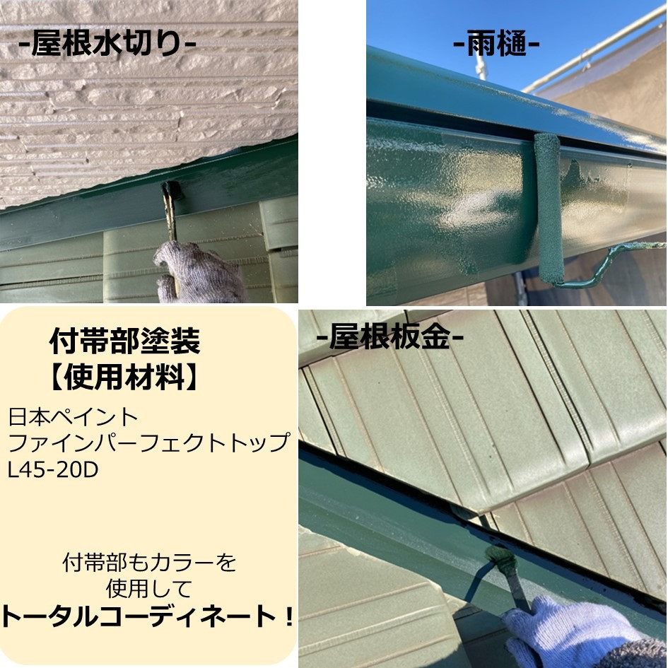 付帯部の色は、場所によってブラウンとL45-20Dのグリーンの塗料を使用してお家全体をトータルコーディネート♪