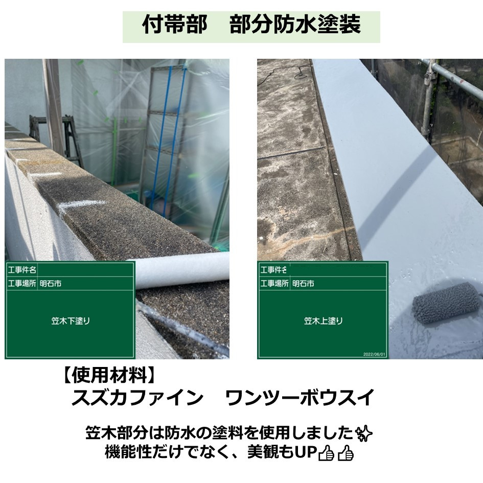 付帯部の笠木部分は、スズカファイン ワンツーボウスイを使用して防水塗装を行いました!