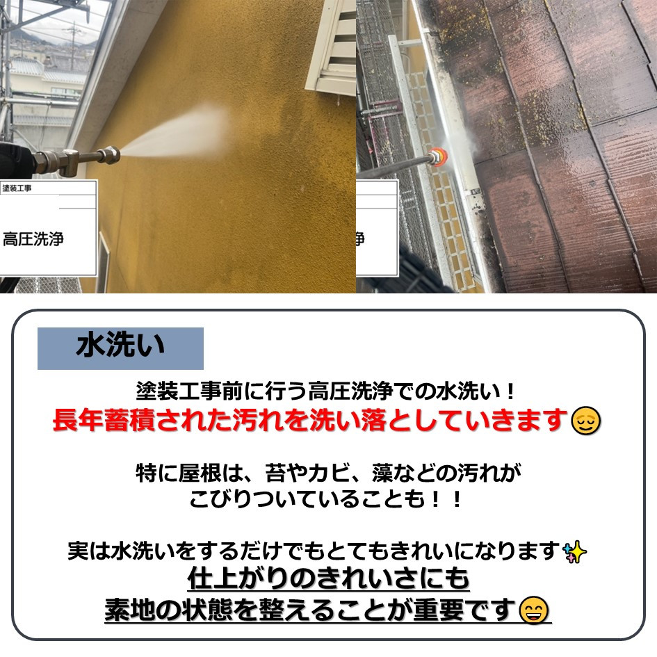 足場をたてて塗装工事前に行う高圧洗浄での水洗い!