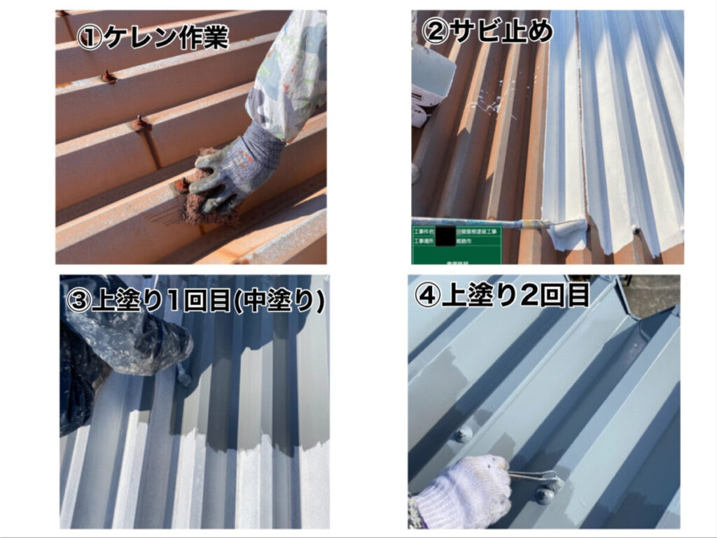 今回の屋根塗り替えでは、ケレン作業といって表面の古い塗膜やサビを落とす作業を丁寧にしてから、上塗りをしました。