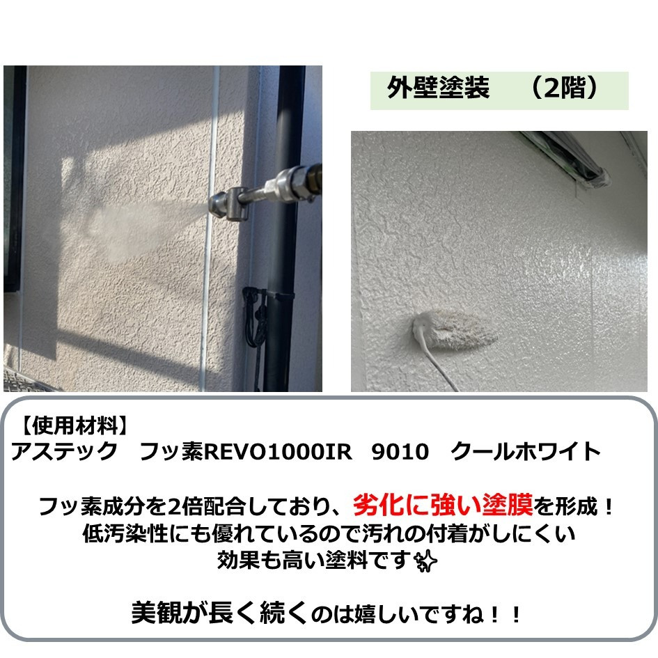 フッ素成分を2倍配合しており、劣化に強い塗膜を形成!低汚染性にも優れているので汚れの付着がしにくい効果も高い塗料です👏👏
