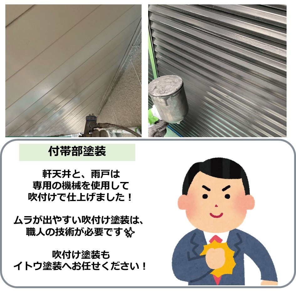 軒天上と、雨戸は専用の機械を使用して吹付けで仕上げました!