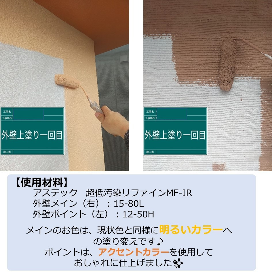今回使用したアステックの超低汚染リファインMF-IRは、汚れがつきにくいだけでなく雨で汚れを洗い落とすことが出来るセルフクリーンング効果の高い塗料です✨✨