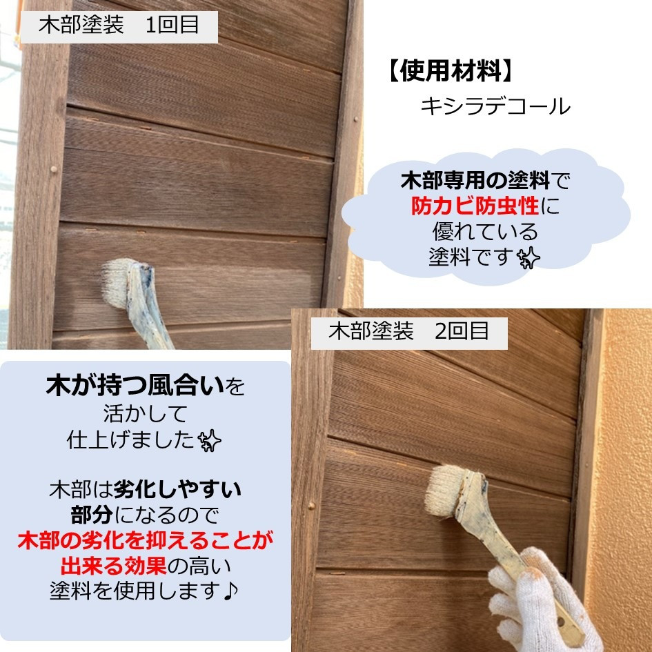 木部は劣化しやすい部分になるので木部の劣化を抑えることが出来る効果の高い塗料を使用し、