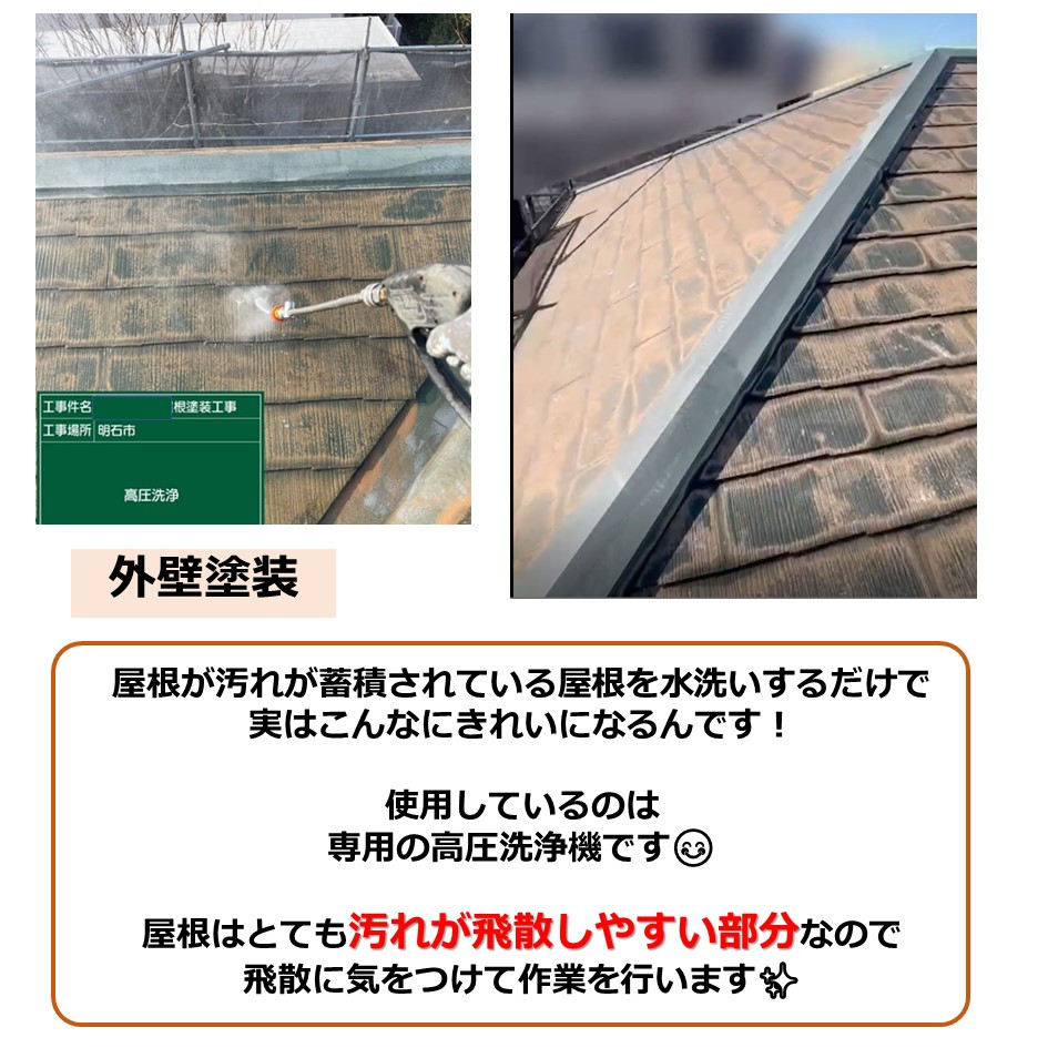 屋根は外壁よりも汚れが蓄積されていることが多く、水洗いをするだけでも洗浄箇所はとてもきれいになります😉