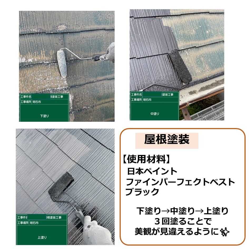 下塗り→中塗り→上塗り3回塗ることで美観が見違えるようなブラックの屋根に大変身✨