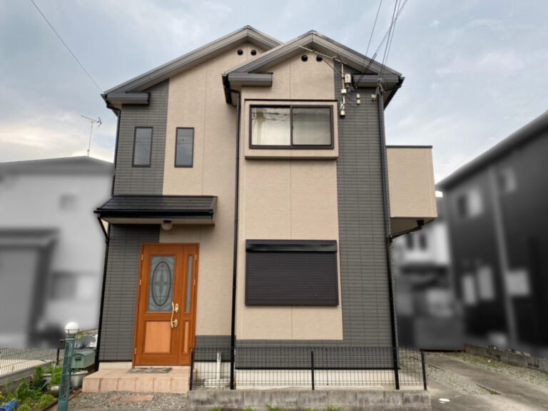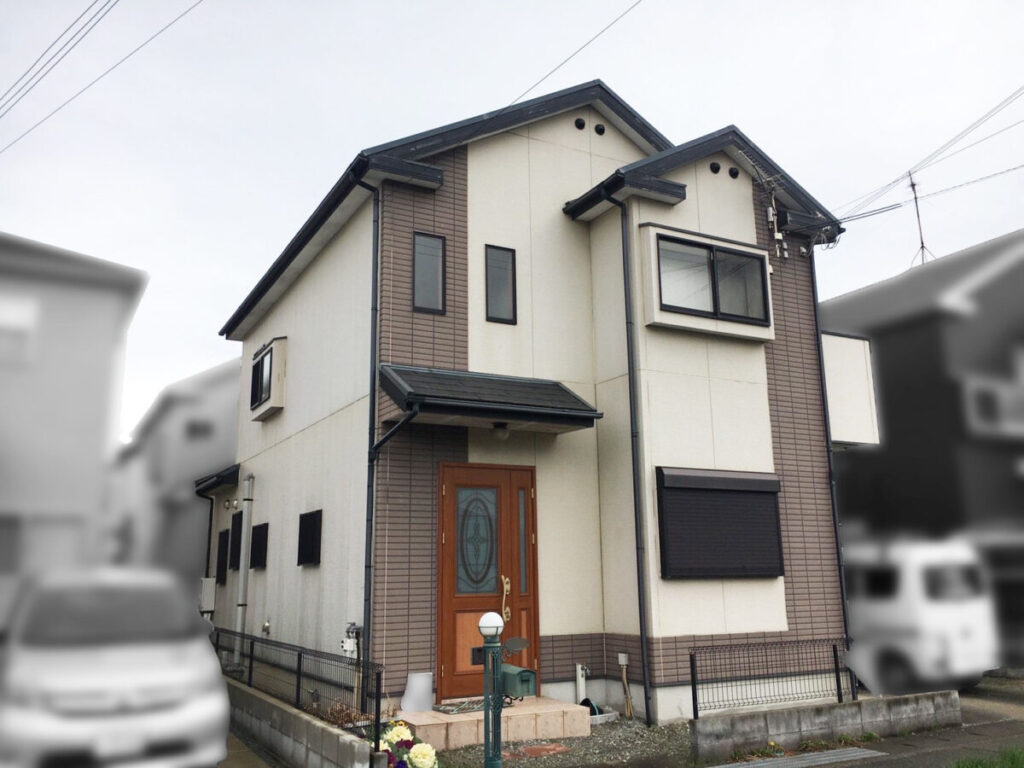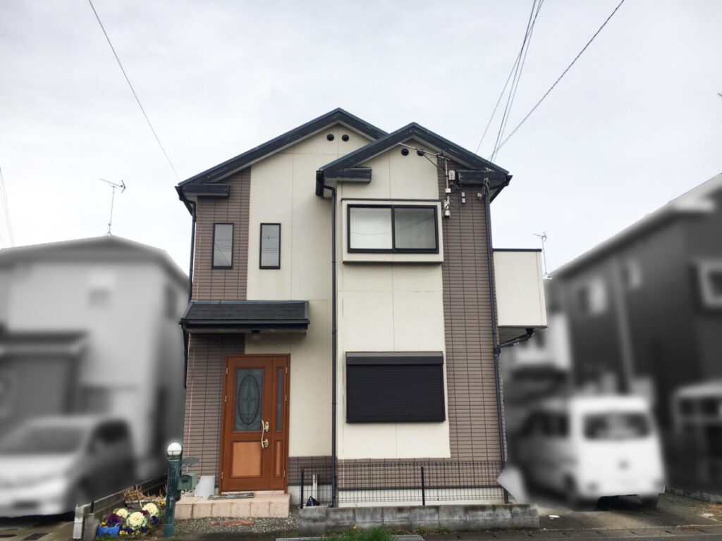 模様の違うサイディングを2色に塗り分けた物件です。