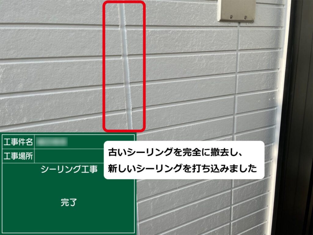 外壁材と外壁材の隙間(目地)にある弾力のある柔らかい部分(シーリング・コーキング)が傷んでいたので、プロの技術でキレイに補修を行いました✨