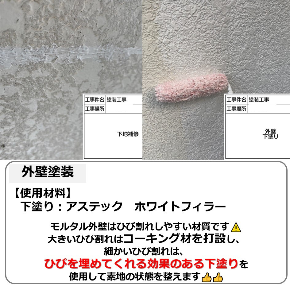 大きいひび割れはコーキング材を打設し、細かいひび割れは、ひびを埋めてくれる効果のある下塗りを使用して素地の状態を整えます👍️👍️