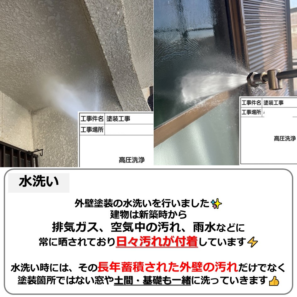 水洗い時には、その長年蓄積された外壁の汚れだけでなく塗装箇所ではない窓や土間・基礎も一緒に洗っていきます👍️