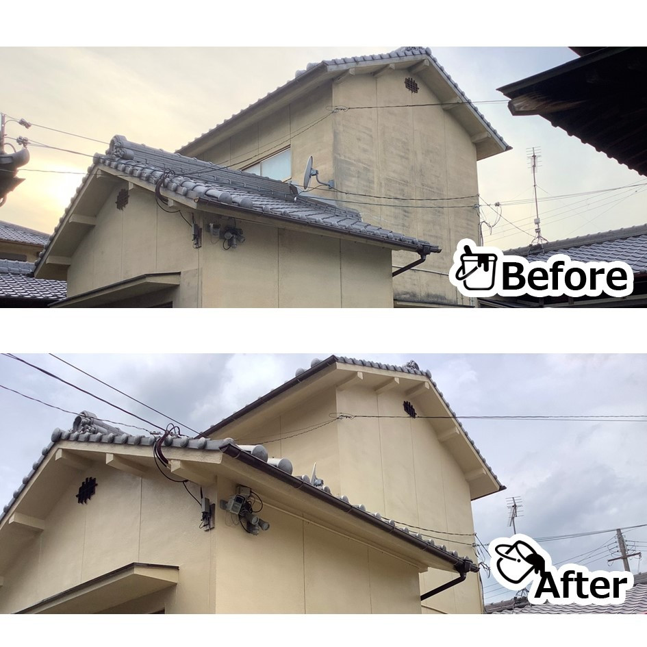 まずは、高圧洗浄で長年蓄積した汚れカビ・藻、古い塗膜をまとめて洗い流していきます。