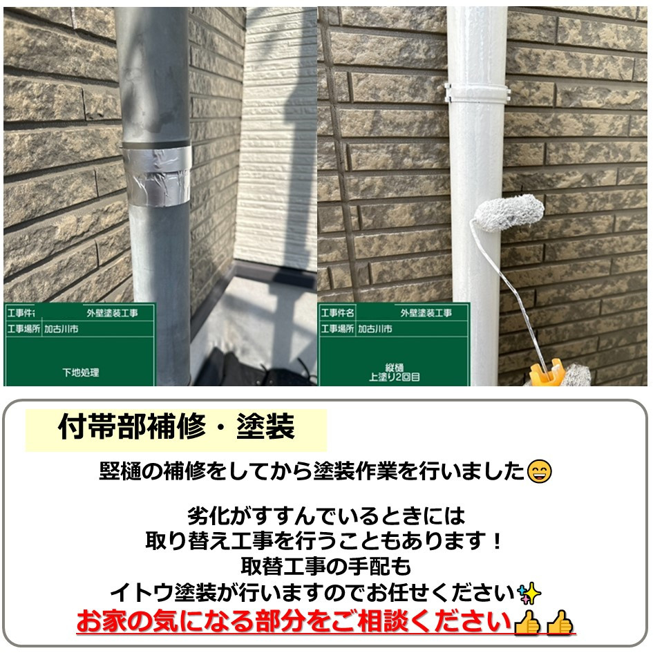 竪樋に劣化が見られましたので、補修をしてから塗装作業を行いました😄