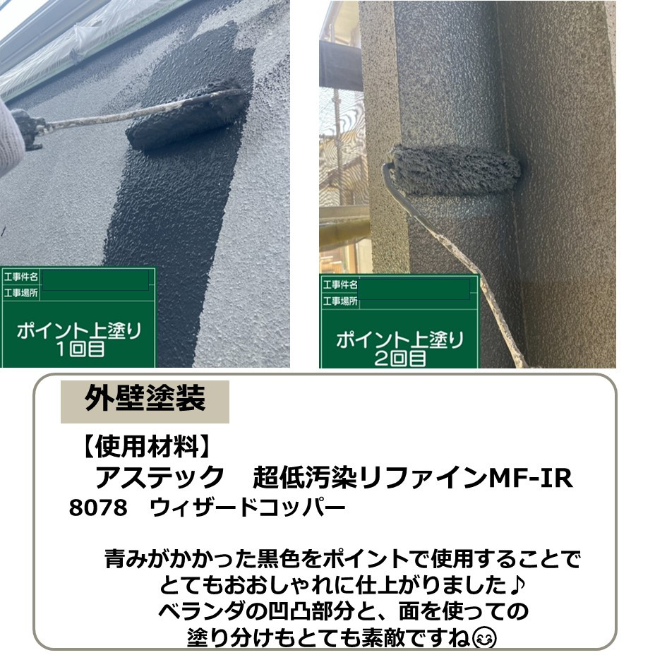 塗り分けの方法は様々ですが今回のように、ベランダの凹凸部分と、面を使っての塗り分けもとても素敵ですね😊