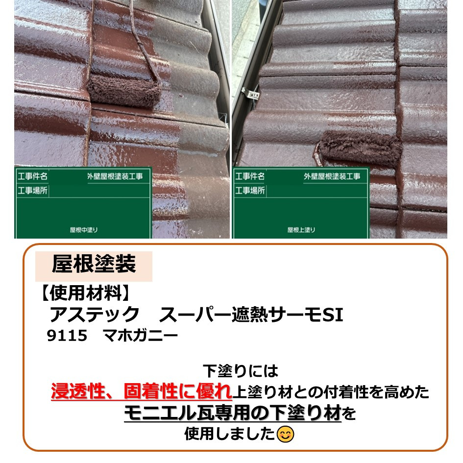屋根の下塗りには、浸透性、固着性に優れ上塗り材との付着性を高めたモニエル瓦専用の下塗り材を使用しました😊