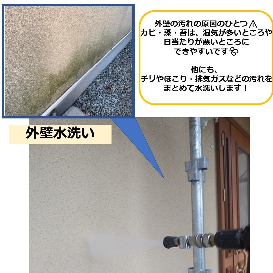 また、外壁の汚れの原因のカビ・藻・苔は、湿気が多いところや