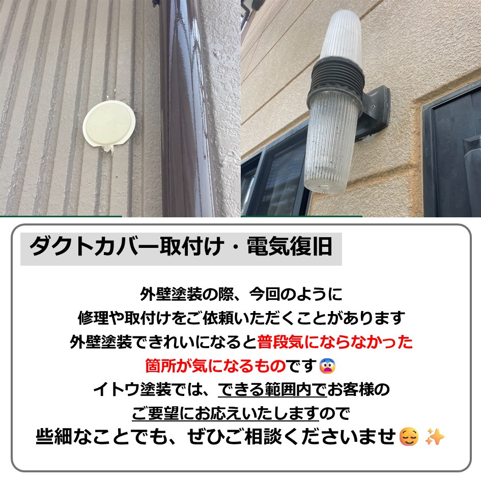 外壁塗装と一緒に、ダクトカバー取付け・電気復旧を行いました