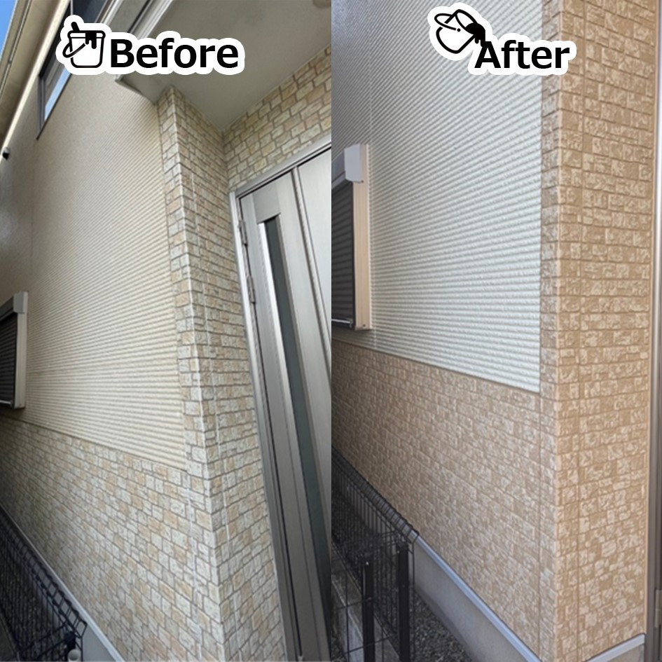 玄関のポイント部分は意匠性のある外壁の柄を崩さずに外壁の目地とタイル、凹凸部分を活かして2色仕上げを行いました✨