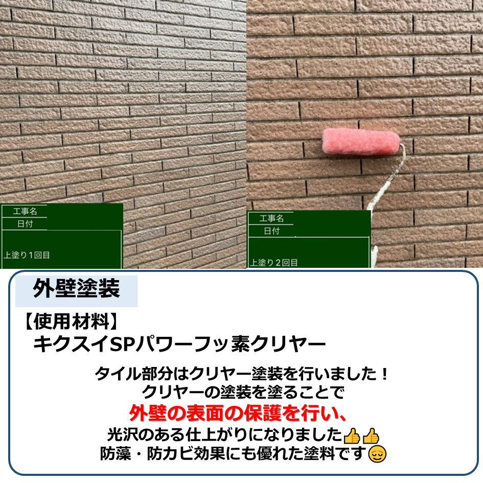 クリヤーの塗装を塗ることで外壁の表面の保護を行い、光沢のある仕上がりになりました👍️👍️