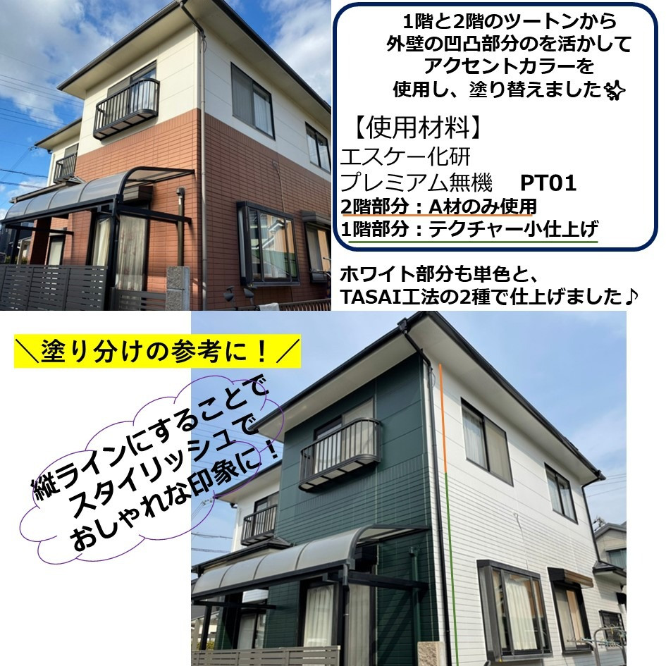 今回のお家は、外壁の色をガラっと変えただけでなく!色分けのラインも変更して仕上げました♪