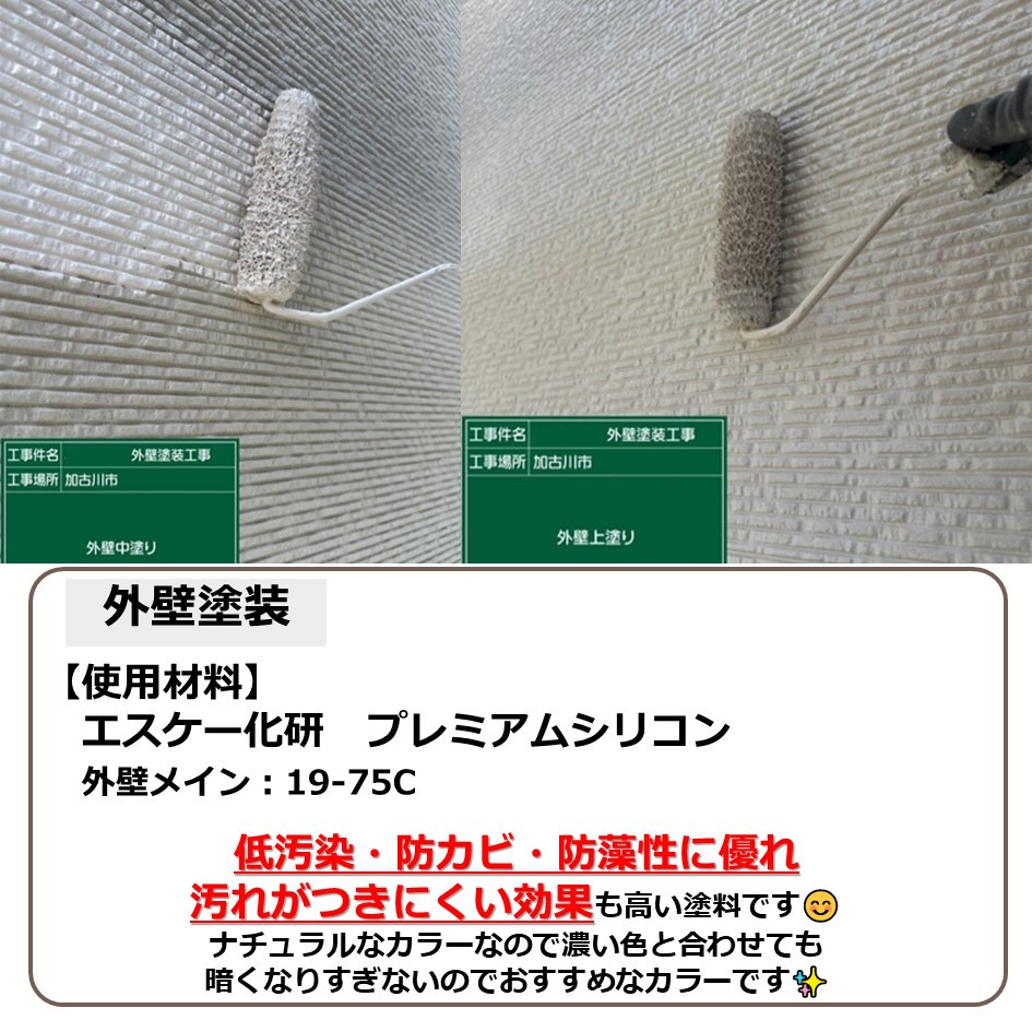 兵庫県加古川市で「エスケー化研 プレミアムシリコン」を使用した施工物件の紹介です。