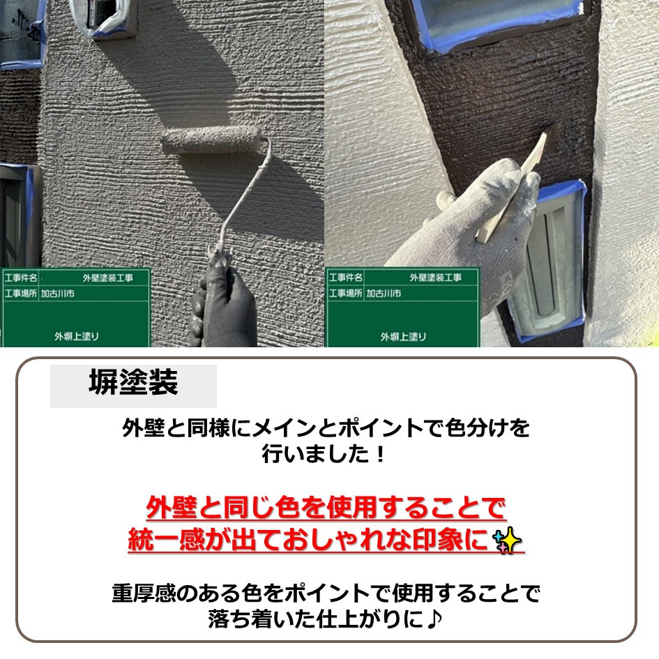 外壁に使用したのは、低汚染・防カビ・防藻性に優れ、汚れがつきにくい効果も高い塗料です😊