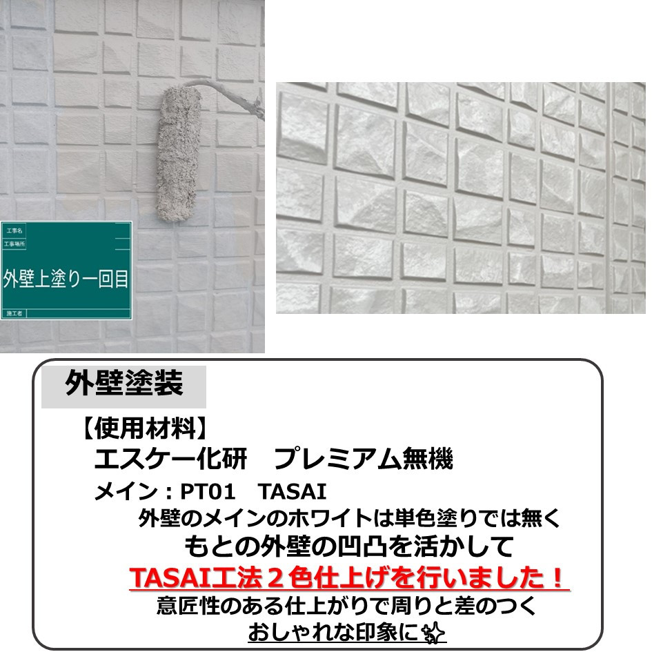 外壁のメインのホワイトは単色塗りでは無くもとの外壁の凹凸を活かして、TASAI工法2色仕上げを行いました!