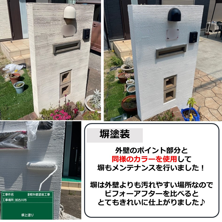外壁のポイント部分同様のカラーを使用して塀もメンテナンスを行いました!